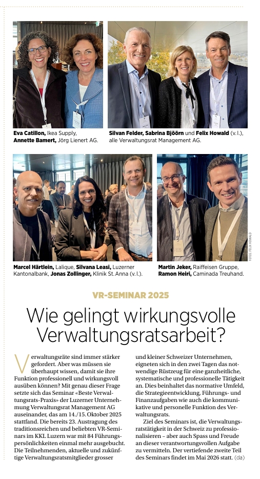 Mit dem fragenden Titel "Wie gelingt wirkungsvolle Vewaltungsratsarbeit" beschreibt die Handelszeitung die Thematik des Seminars sehr gut. Denn es geht genau darum, wie man die VR-Arbeit effektiv und effizient umsetzt, wie man sich als VR-Germium professionell verhält - und bei all den Pflichten auch noch Freude und Spass hat!